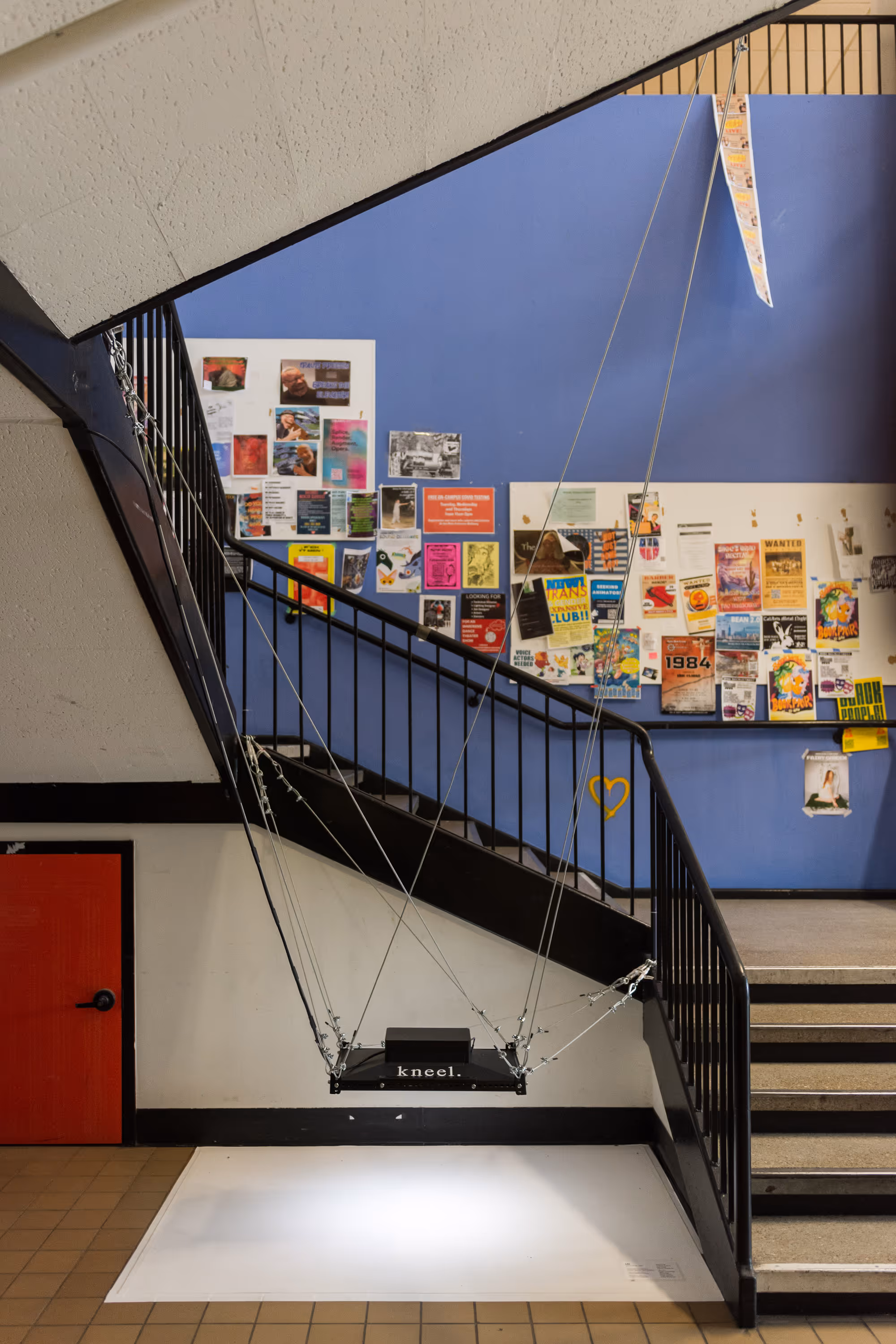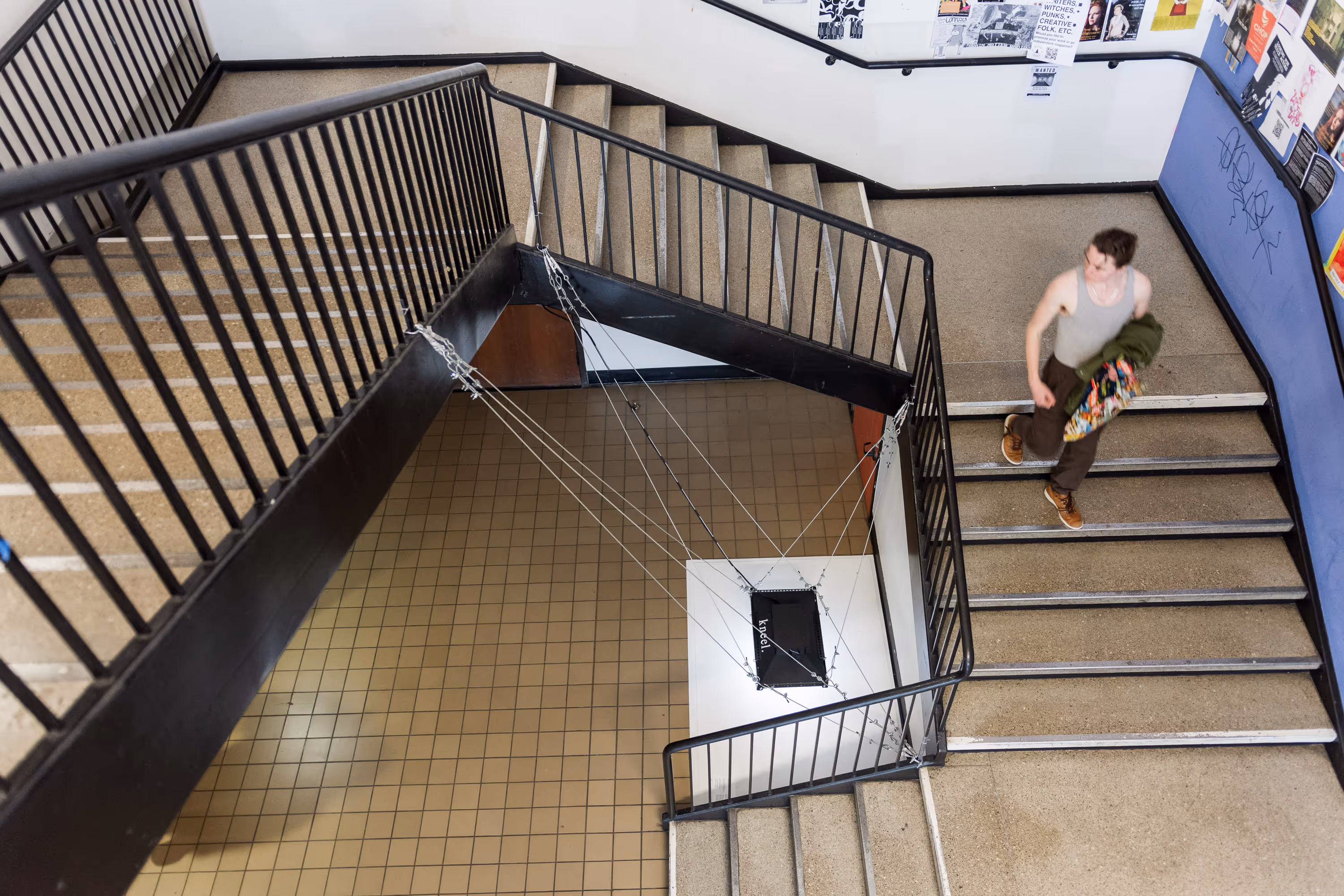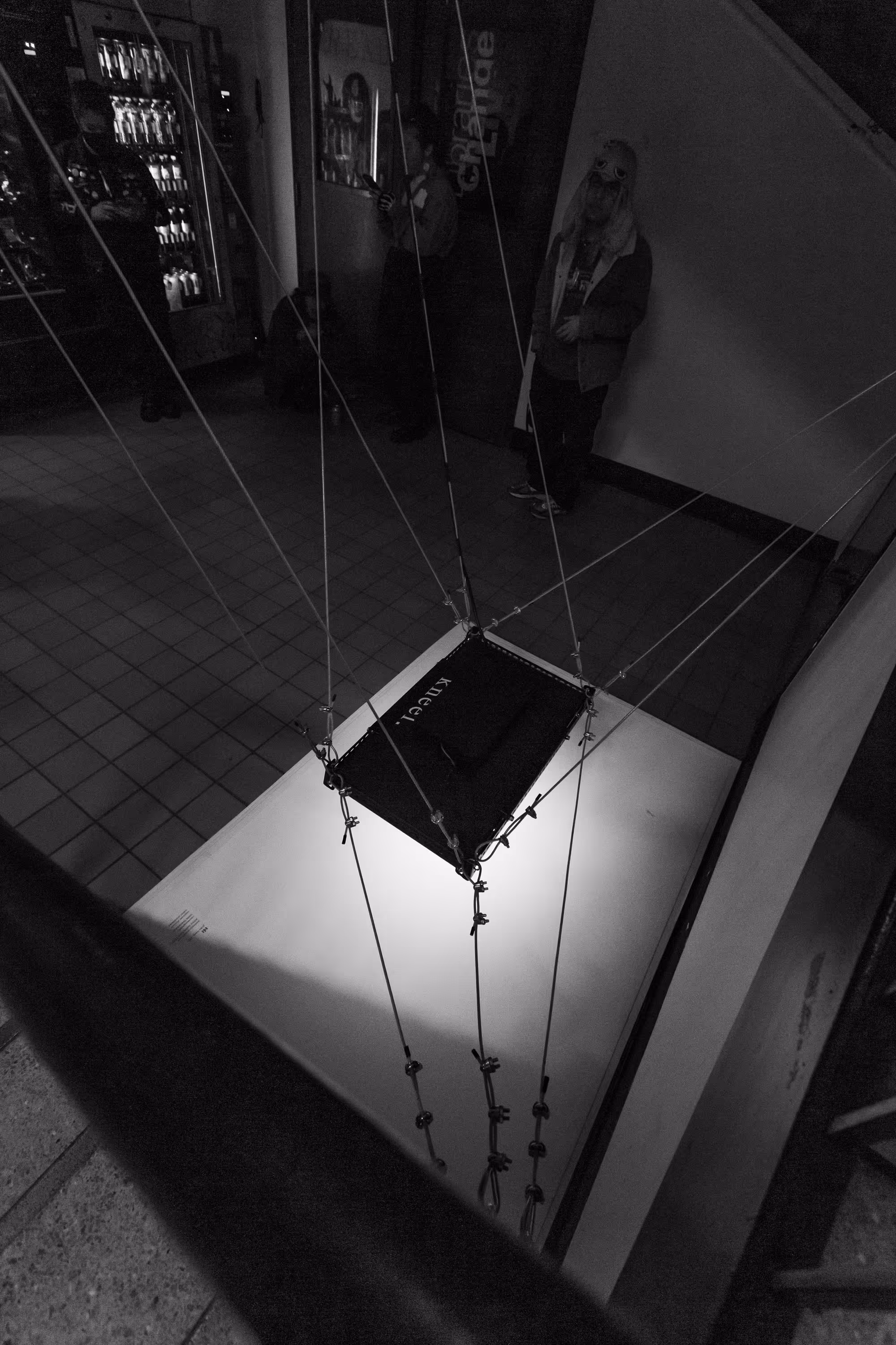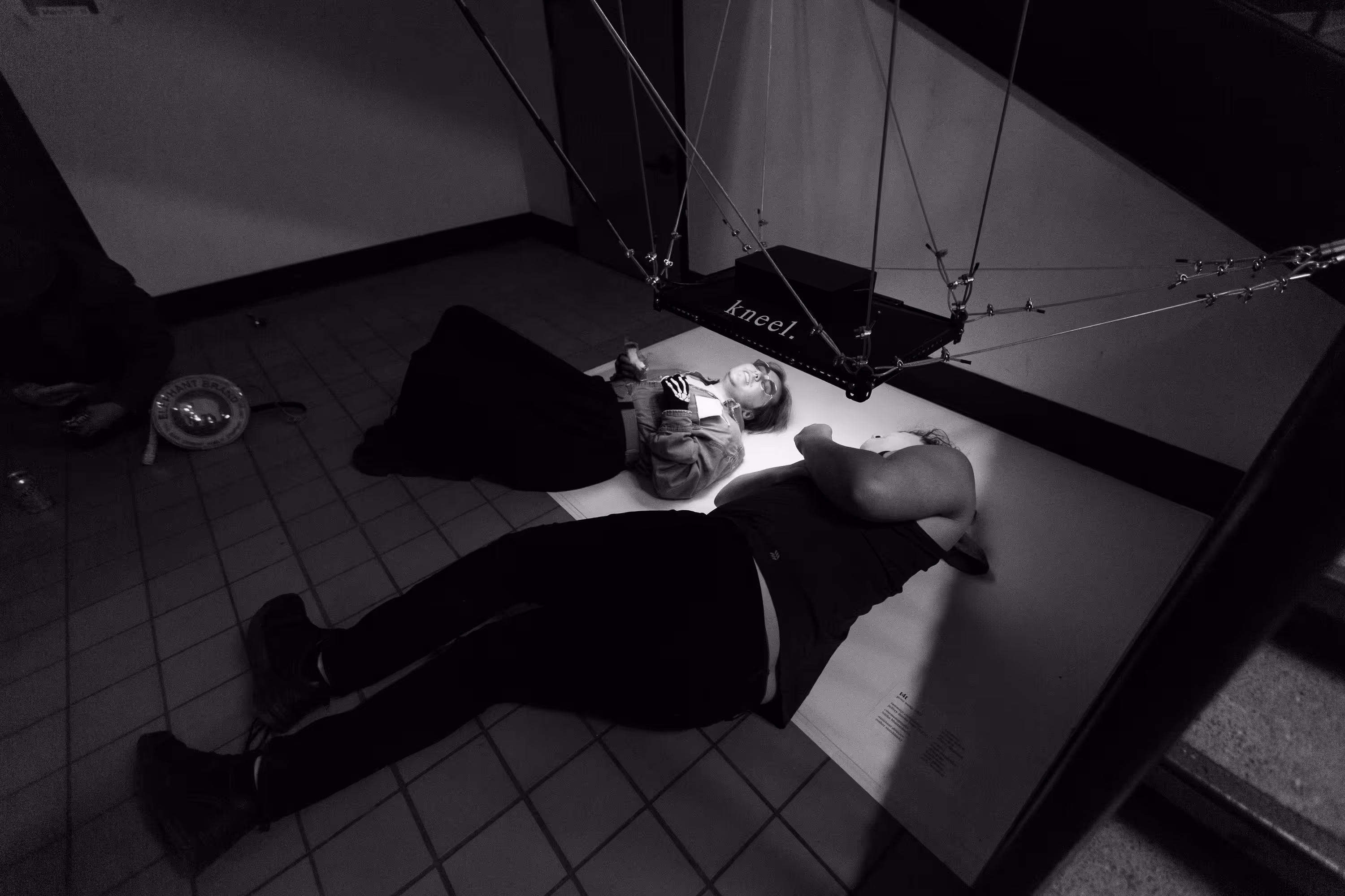 t4t is a site-specific video installation is located in a high-traffic, high-visibility public area. However, the area beneath the monitor is secluded and intimate, with enough room for two people lying on the floor. To see the film, the audience must trespass upon this private trans space, kneeling, clambering, and squeezing their bodies into submissive positions in full public view.